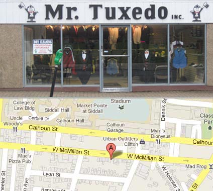 Mr. Tuxedo is located in the heart of Clifton on the campus of the University of Cincinnati. This Mr. Tuxedo is run by manager, Mr. Sean Kelley. Please feel free to call or email if you have any questions regarding tuxedo rental.